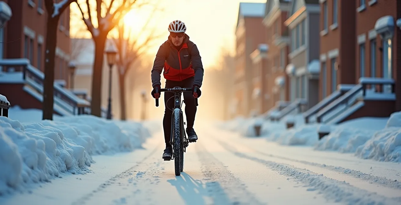 Le son métallique des pneus à clous sur l’asphalte nu est la mélodie du cycliste hivernal québécois. Pour le néophyte, c’est le signal d’un défi intimidant ; pour l’initié, celui d’une liberté reconquise sur l’hiver. Face aux rues couvertes de glace noire ou de cette « slush » grise et corrosive, beaucoup choisissent de ranger leur monture. Les conseils habituels fusent : « mets des pneus d’hiver », « habille-toi chaudement », « sois visible ». Si ces recommandations sont justes, elles restent en surface et omettent l’essentiel. Elles traitent l’équipement comme une simple liste de courses, sans en expliquer la physique et la chimie.